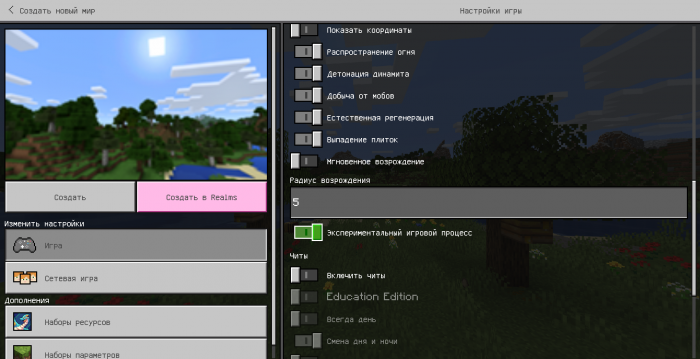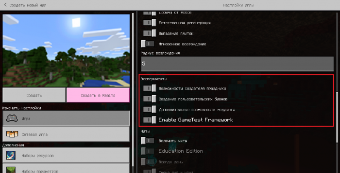 - Перейдите в настройки мира и найдите раздел "Эксперименты";