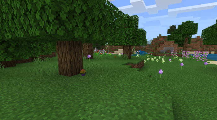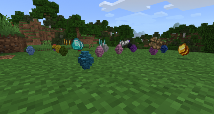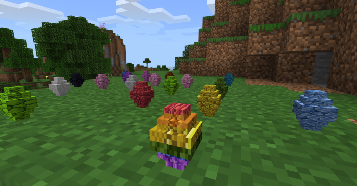 Доступно больше 5 разных цветов с красивой текстурой и дизайном. Если сломать один из яиц - выпадут предметы. В основном можно заметить золото, семена свеклы, алмазы, седло, железо и оружие по несколько штук. Пасхальные яйца можно найти почти во всех биомах кроме равнинах, пустынях, мезах или под водой.