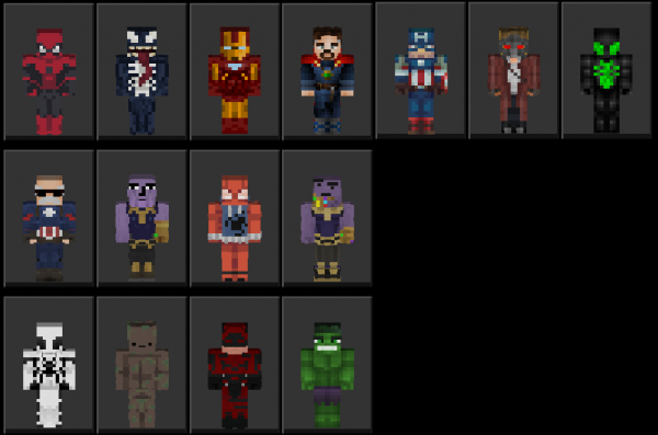Хочешь спасти землю от поражения? Используйте 15 качественных скинов которые смогут спасти человечество от возможных угроз. Скины представляют самых знаковых персонажей из фильма Марвел.